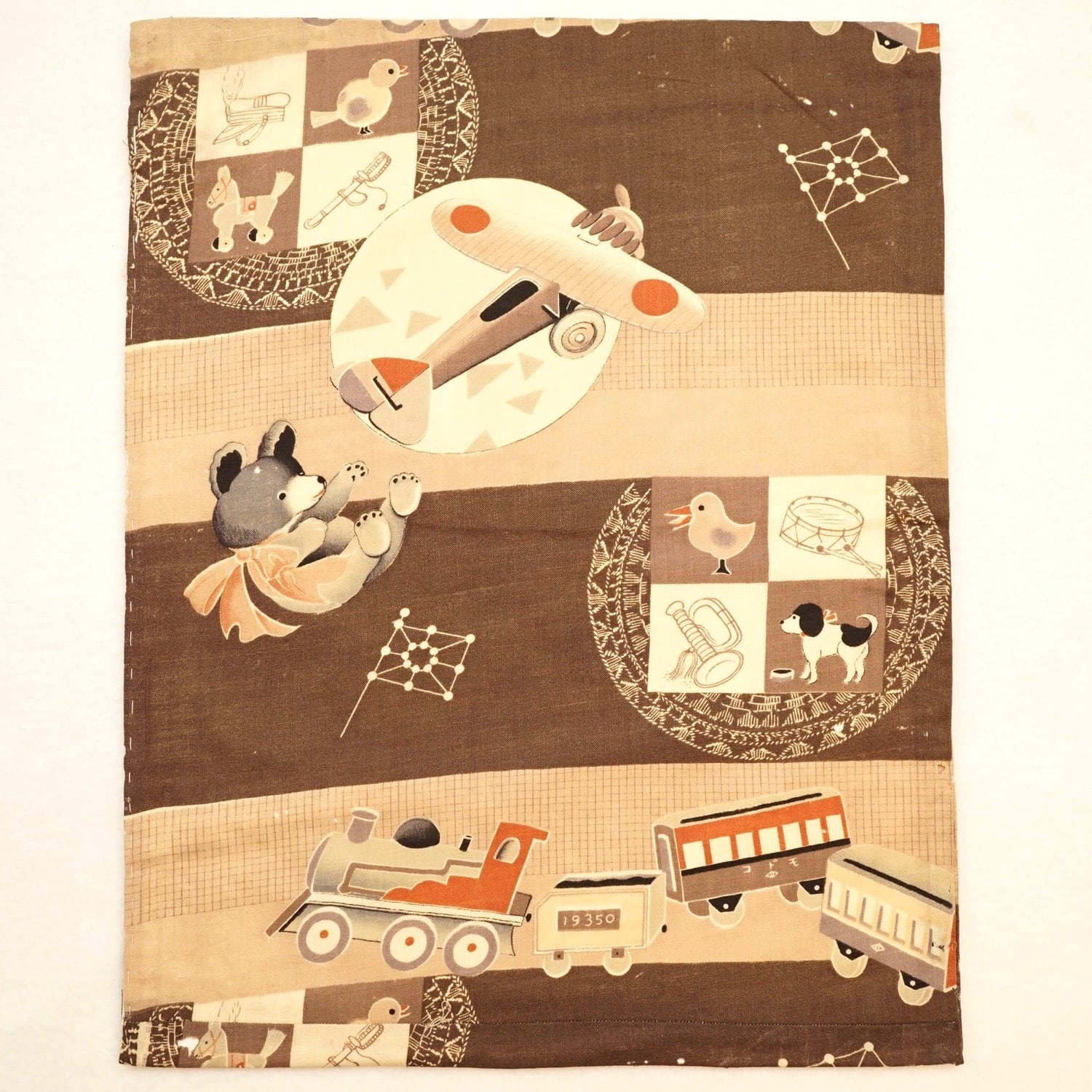 プロペラ機や汽車、クマのぬいぐるみ、犬、ラッパ、太鼓などかわいい絵がたくさん描かれています。