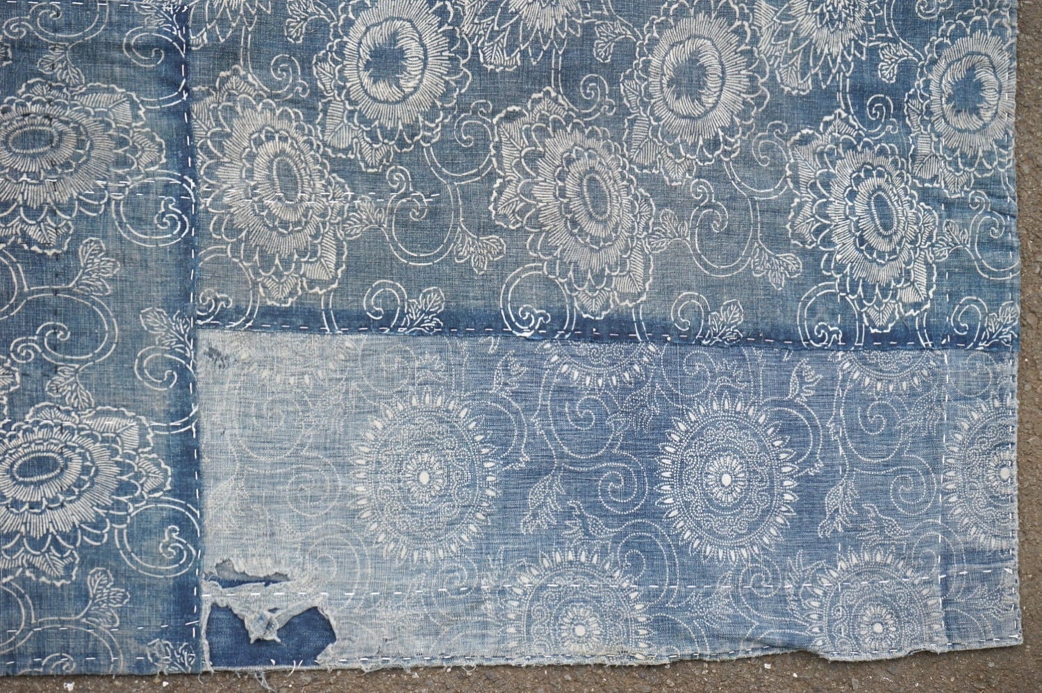 2種類の型染め(菊唐草)が継ぎ接ぎされた、木綿のボロです。