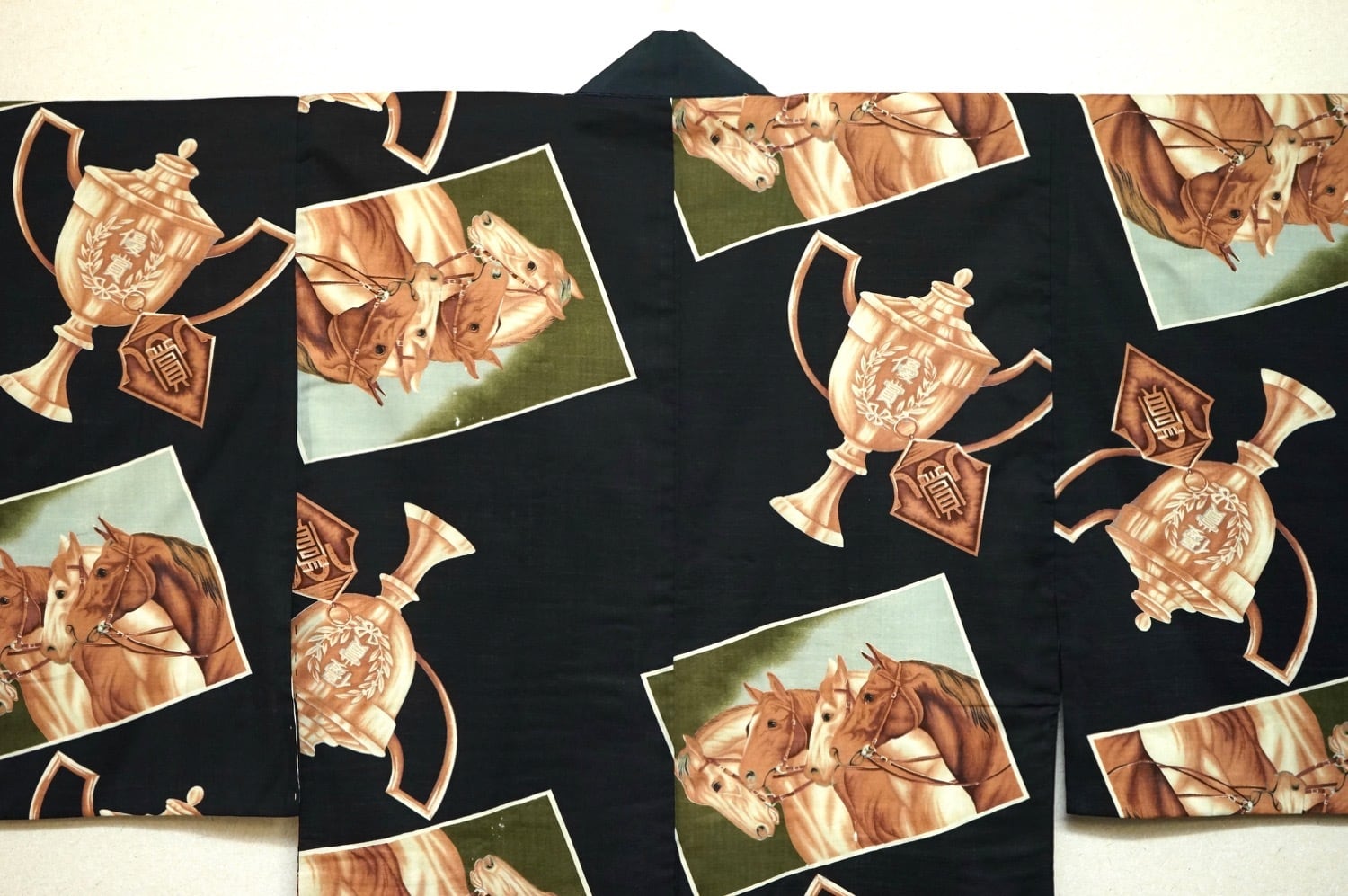 馬と優勝カップが描かれた面白柄男物襦袢です。